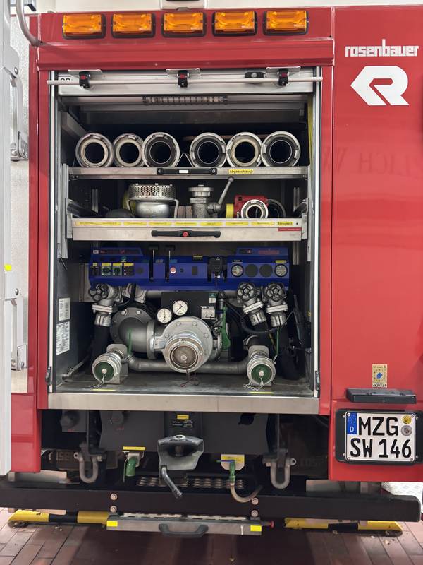 Zur Brandbekämpfung führt das Fahrzeug 2500 Liter Wasser mit sich. Die Pumpe leistet 2000 Liter in der Minute. Als Einrichtung zur schnellen Wasserabgabe wurde die Haspel mit formstabilem Druckschlauch entnommen und gegen einen C-Schlauch in Buchten ersetzt. Somit konnten wir eine Platz- und Gewichtsersparnis erreichen, ohne auf eine Fähigkeit des Fahrzeugs verzichten zu müssen.